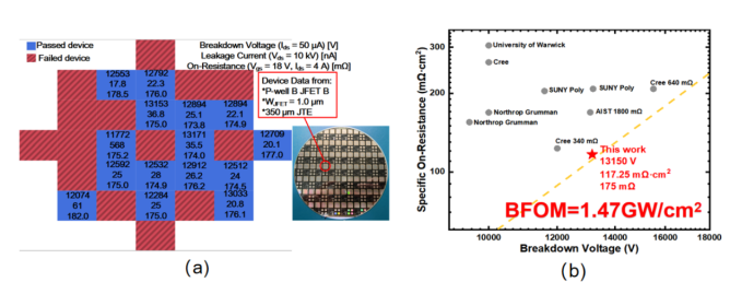 圖2. (a) 10kV SiC MOSFET特性的整晶圓分布,(b) 本次成果與歷史成果對(duì)比。