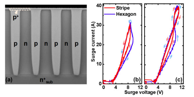 圖3. (a) 制備的超級(jí)結(jié)二極管截面SEM照片,(b) 30A和(c) 40A浪涌電流沖擊下不同元胞類型器件的I-V軌跡。
