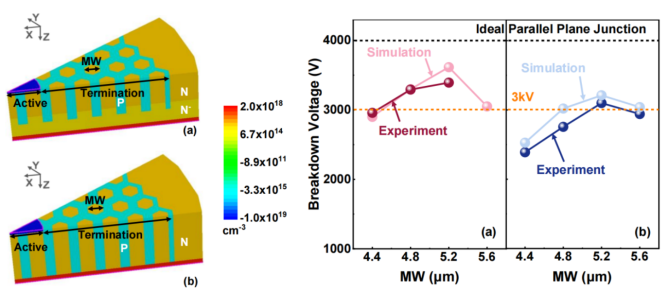 研究成果以”Comparative Study on Charge-Imbalance Super Junction Termination for 3kV 4H-SiC Full-SJ and Semi-SJ Devices”為題目發(fā)表在IEEE ISPSD 2025上并作現(xiàn)場(chǎng)口頭匯報(bào),第一作者為博士生張弛,通訊作者為王珩宇研究員。