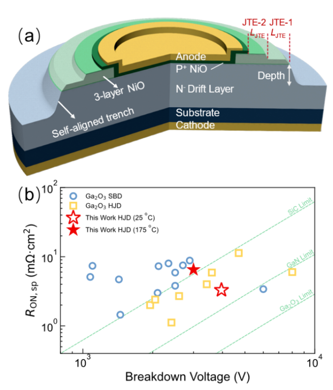 本研究展示一種新型垂直 β-氧化鎵(β-Ga?O?)異質(zhì)結(jié)二極管(HJD),采用自對(duì)齊多區(qū)結(jié)終端擴(kuò)展(SA-MZJTE)技術(shù),實(shí)現(xiàn) 3.9 kV擊穿電壓,比導(dǎo)通電阻 3.5 mΩ·cm2,功率品質(zhì)因數(shù) 4.3 GW/cm2,且在 175 ℃高溫下?lián)舸╇妷撼?3000 V,性能處于千伏級(jí) Ga?O?二極管頂尖水平,表明 SA-MZJTE 是適用于中高壓、高溫 Ga?O?功率應(yīng)用的高效終端解決方案。