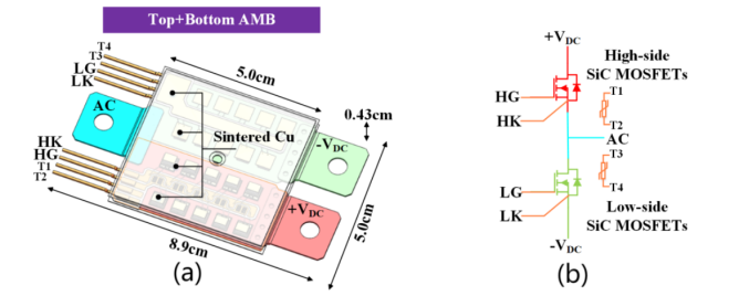 圖6. 提出的1200V 600A DSC SiC功率模塊結(jié)構(gòu). (a) 銅燒結(jié)在DSC模塊中的應(yīng)用. (d) 模塊的等效電路圖.