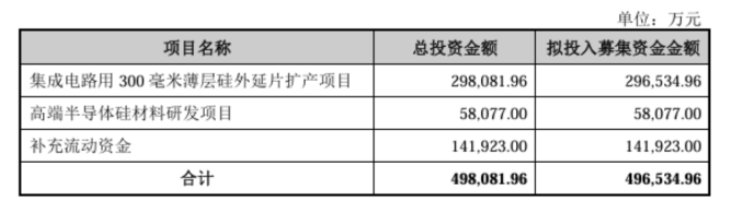 本次上海超硅IPO擬募集資金49.65億元,投向集成電路用300mm薄層硅外延片擴(kuò)產(chǎn)項(xiàng)目、高端半導(dǎo)體硅材料研發(fā)項(xiàng)目,以及補(bǔ)充流動(dòng)資金,投資金額分別為298,081.96萬(wàn)元、58,077.00萬(wàn)元、141,923.00萬(wàn)元。