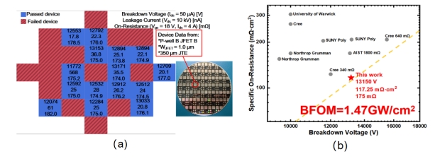 圖2. (a) 10kV SiC MOSFET特性的整晶圓分布,(b) 本次成果與歷史成果對比。