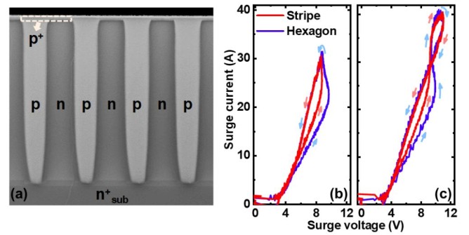 圖3. (a) 制備的超級結(jié)二極管截面SEM照片,(b) 30A和(c) 40A浪涌電流沖擊下不同元胞類型器件的I-V軌跡。