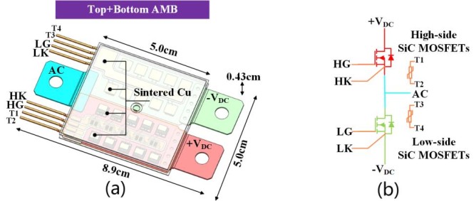 圖6. 提出的1200V 600A DSC SiC功率模塊結(jié)構(gòu). (a) 銅燒結(jié)在DSC模塊中的應(yīng)用. (d) 模塊的等效電路圖.