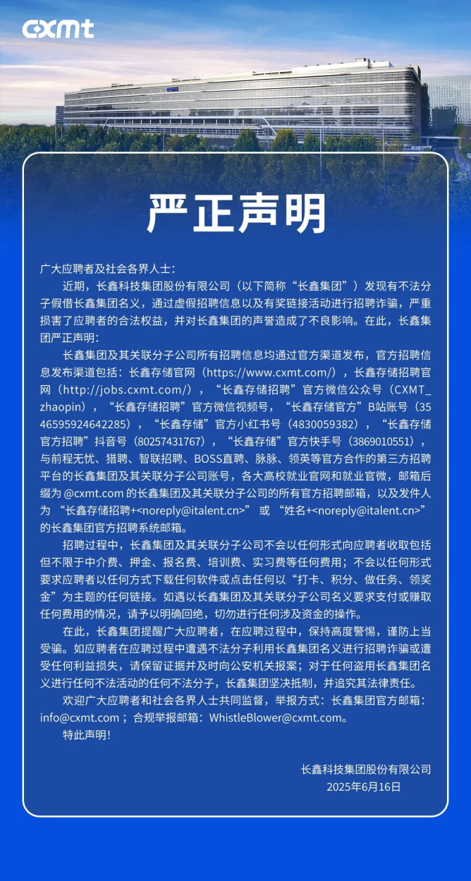長鑫科技集團股份有限公司嚴(yán)正聲明