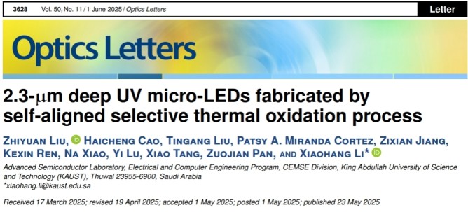 Zhiyuan Liu, Haicheng Cao, Tingang Liu, Patsy A. Miranda Cortez, Zixian Jiang, Kexin Ren, Na Xiao, Yi Lu, Xiao Tang, Zuojian Pan, and Xiaohang Li, "2.3-μm deep UV micro-LEDs fabricated by self-aligned selective thermal oxidation process," Opt. Lett. 50, 3628-3631 (2025)