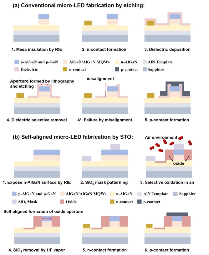 圖一. 采用 (a) 反應離子刻蝕和 (b)選擇性熱氧化技術(shù)進行 Micro-LED制造的工藝流程。