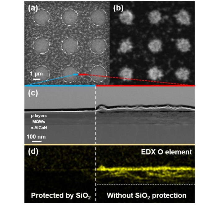 圖二. (a) 像素陣列的SEM圖像;(b) 270 nm波長下的像素陣列CL圖像;(c) 像素界面的橫截面TEM圖像;(d) EDX測量的像素界面附近的氧元素分布。