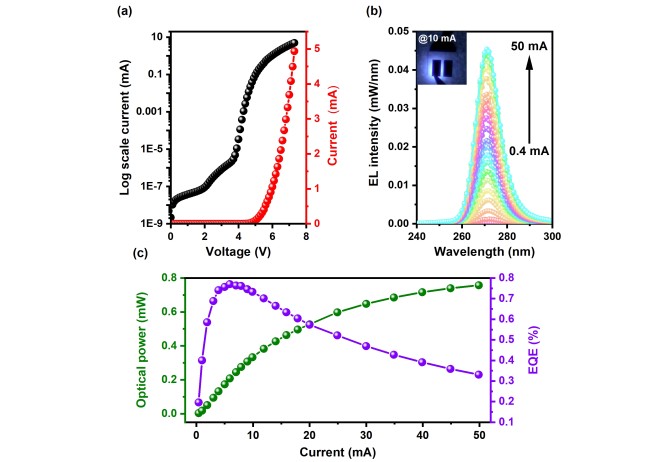 圖三. 像素尺寸為 2.3 微米的 DUV Micro-LED 陣列性能表征。(a) I-V 特性;(b) 0.4 至 50 mA 電流下的發(fā)射光譜;(c)光功率和 EQE 曲線。
