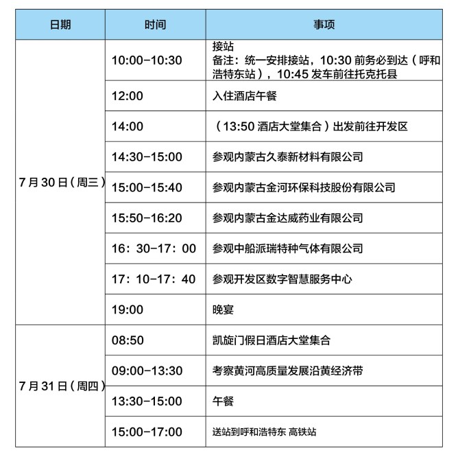 2、行程:參加考察的人員,請于7月30日10:15前務(wù)必到達(dá)(呼和浩特東站),安排統(tǒng)一接站,錯過此時間,請自行前往托克托縣。