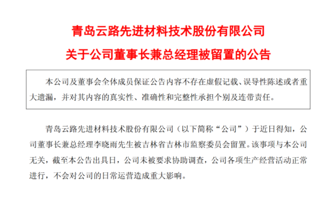 先進(jìn)磁性金屬材料云路先進(jìn)材料發(fā)布公告稱,其董事長兼總經(jīng)理李曉雨已被吉林省吉林市監(jiān)察委員會采取留置措施。公司強調(diào),此事件與公司無直接關(guān)聯(lián),且截至公告發(fā)布之時,公司未收到任何協(xié)助調(diào)查的要求,所有生產(chǎn)經(jīng)營活動均正常進(jìn)行,不會對公司的日常運作造成重大影響。