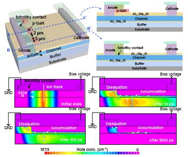 圖2. 抗輻照加固設(shè)計(jì)GaN功率二極管和輻照下電荷輸運(yùn)過(guò)程
