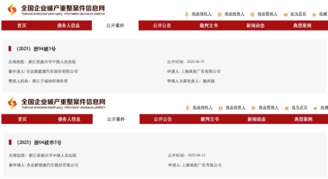 5月13日,合眾新能源汽車股份有限公司新增(2025)浙04破申3號(hào),合眾新能源汽車股份有限公司被上海禹形廣告有限公司申請(qǐng)破產(chǎn)重整,經(jīng)辦法院為浙江省嘉興市中級(jí)人民法院。彼時(shí),哪吒汽車方面回應(yīng)稱:“某廣告公司向法院申請(qǐng),這是這家公司應(yīng)有的權(quán)力,目前我們內(nèi)部沒(méi)有申請(qǐng)破產(chǎn)相關(guān)事宜。不信謠,不傳謠。”接近哪吒汽車的消息人士表示:“公司目前確實(shí)很困難,高層還在尋求自救。”