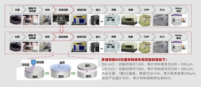 SiC單晶材料的高硬度、極高脆性、高化學(xué)穩(wěn)定性等特性導(dǎo)致其極難加工,行業(yè)主流采用多線切割技術(shù)進(jìn)行SiC襯底的切割加工,單片總材料損耗在280-300 μm,而6inch的SiC襯底成品厚度在350um左右,相當(dāng)于材料損耗率在46%左右。深圳平湖實(shí)驗(yàn)室聚焦SiC激光剝離新技術(shù)的研究與開(kāi)發(fā),旨在大幅降低碳化硅襯底的切割損耗,從而降低碳化硅襯底的成本,促進(jìn)大尺寸SiC襯底規(guī)?;a(chǎn)業(yè)應(yīng)用。