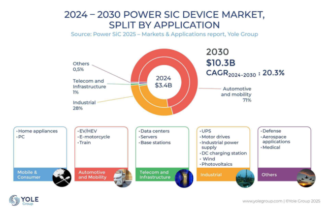 另一方面,Yole指出,積極的一面是高壓汽車平臺的持續(xù)增長勢頭。預(yù)計未來將擴大規(guī)模的800V系統(tǒng)電動汽車,其SiC采用率高于傳統(tǒng)的400V電動汽車,這將推動市場增長。Yole表示,汽車/移動出行領(lǐng)域的需求將繼續(xù)推動SiC功率器件市場的發(fā)展,具體而言,到2030年,SiC功率器件市場將占整個市場的71%。