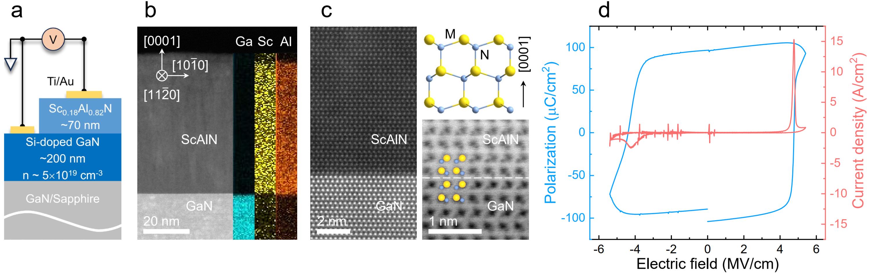 圖1.分子束外延生長的單晶鐵電ScAlN/GaN異質結。