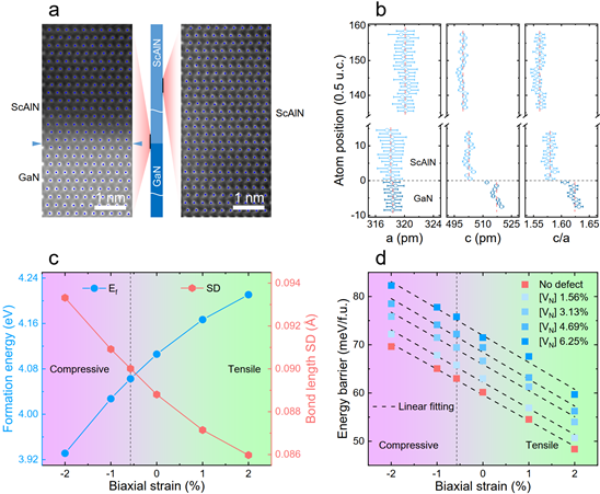 圖5.鐵電ScAlN中應變、氮空位和極化翻轉勢壘之間的聯(lián)系。