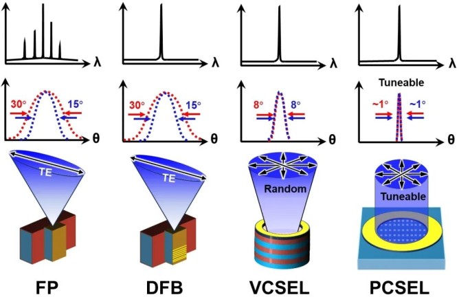 圖1. FP腔邊發(fā)射激光器、DFB邊發(fā)射激光器、VCSEL和PCSEL的結(jié)構(gòu)示意圖、典型遠(yuǎn)場(chǎng)發(fā)散角及輸出光譜特性。