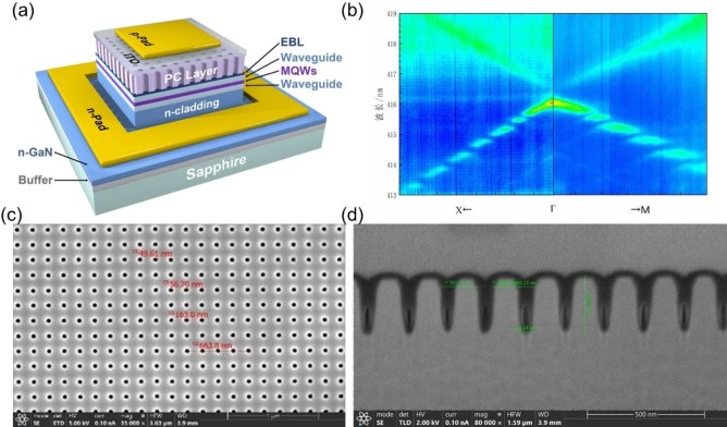 圖2. (a) GaN基PCSEL的結(jié)構(gòu)示意圖,(b)光泵測(cè)試得到的光子晶體能帶結(jié)構(gòu),光子晶體的(c)表面和(d)截面掃描電子顯微鏡圖。