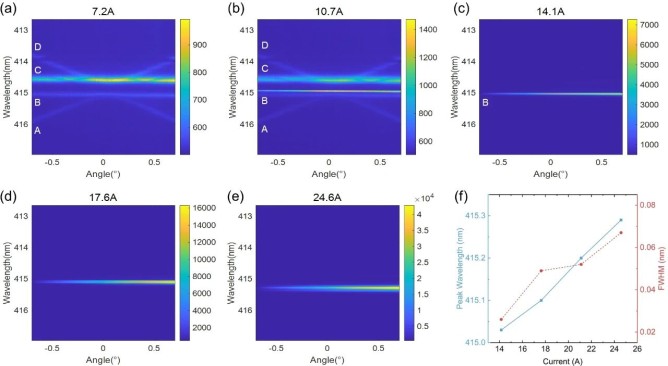 圖3.(a-e)不同注入電流下測(cè)量得到的GaN基PCSEL Γ - X 方向的能帶結(jié)構(gòu),(f) GaN基PCSEL峰值波長(zhǎng)與光譜半高寬隨注入電流的變化曲線(xiàn)。