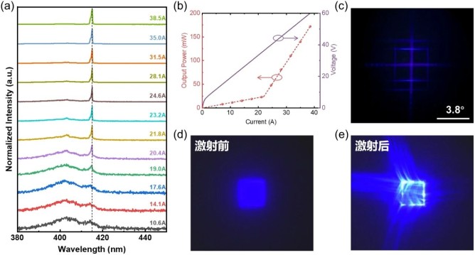 圖4. GaN基PCSEL(a)不同注入電流下的電致發(fā)光光譜、(b)輸出光功率-電流-電壓曲線(xiàn)、(c)遠(yuǎn)場(chǎng)光斑,GaN基PCSEL激射(d)前、(e)后的近場(chǎng)圖像。