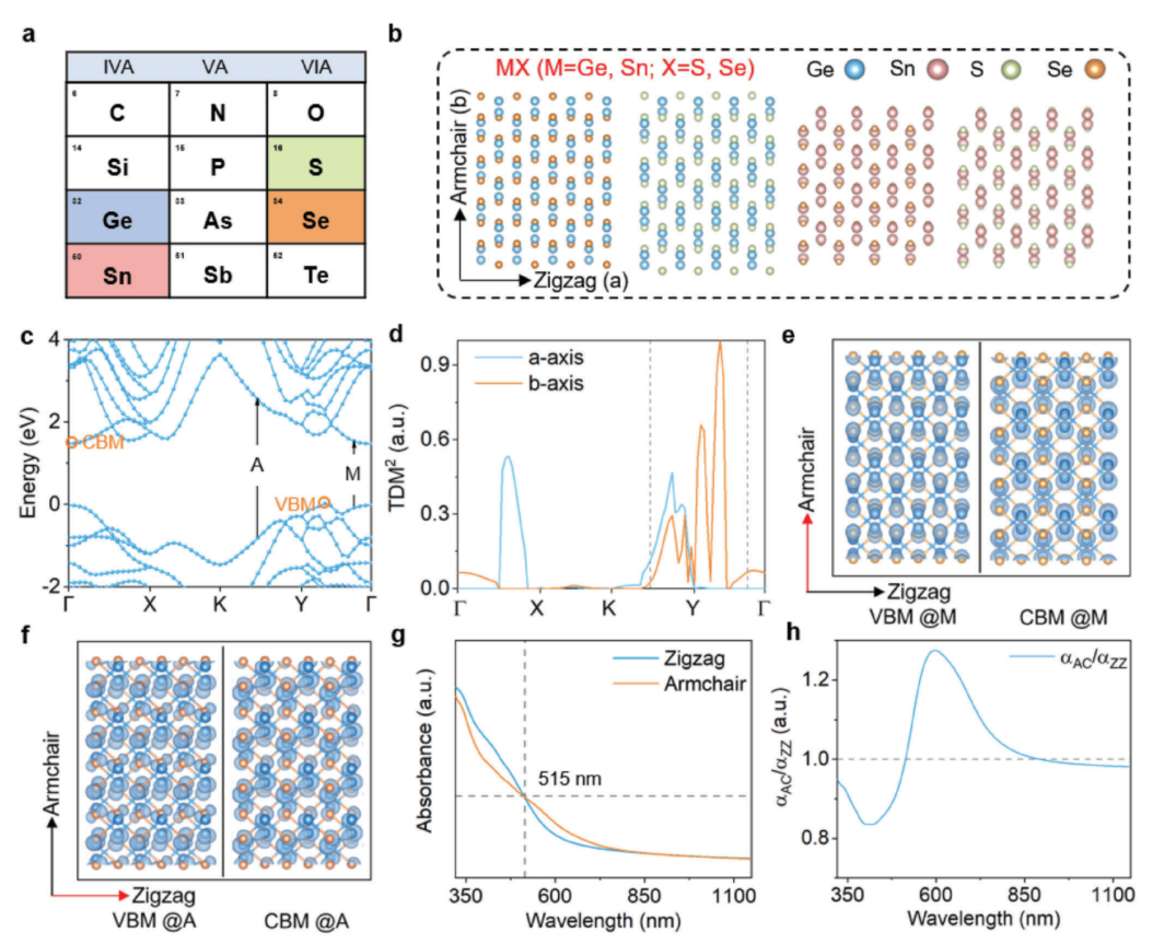 在理論設(shè)計(jì)方面,系統(tǒng)闡明了低維半導(dǎo)體面內(nèi)線二色性的物理機(jī)制,通過(guò)第一性原理計(jì)算,研究了100種由Ⅲ、Ⅳ、V和Ⅵ族半導(dǎo)體常用元素組成的二維半導(dǎo)體及其面內(nèi)線性二色性。研究發(fā)現(xiàn),晶格和帶邊波函數(shù)的面內(nèi)不對(duì)稱(chēng)是面內(nèi)線二色性的主要根源。具有平面內(nèi)正交晶格和單斜晶格的二維半導(dǎo)體容易產(chǎn)生相當(dāng)大的面內(nèi)線二色性,而六方晶格的二維半導(dǎo)體則具有光學(xué)各向同性。正交晶格的二維半導(dǎo)體具有較大的面內(nèi)偏振光敏感特性,這是由于晶格中的固有對(duì)稱(chēng)鏡面導(dǎo)致了帶邊波函數(shù)的面內(nèi)奇偶性。進(jìn)而發(fā)現(xiàn),由這些二維半導(dǎo)體形成的異質(zhì)結(jié)構(gòu)顯示出更高的光吸收、更強(qiáng)的面內(nèi)線二色性和各種類(lèi)型(I、Ⅱ、Ⅲ型)的帶階,為二維光學(xué)各向異性半導(dǎo)體在偏振光探測(cè)領(lǐng)域的應(yīng)用提供了一定的理論參考。相關(guān)研究以“Physical origin of planar linear dichroism in van der Waals semiconductors using main group elements”為題發(fā)表于《中國(guó)科學(xué)-信息科學(xué)》(Science China Information Sciences 2024, 67 (12), 222402.,第一作者高強(qiáng)博士,通訊作者魏鐘鳴、北京計(jì)算科學(xué)中心康俊研究員)