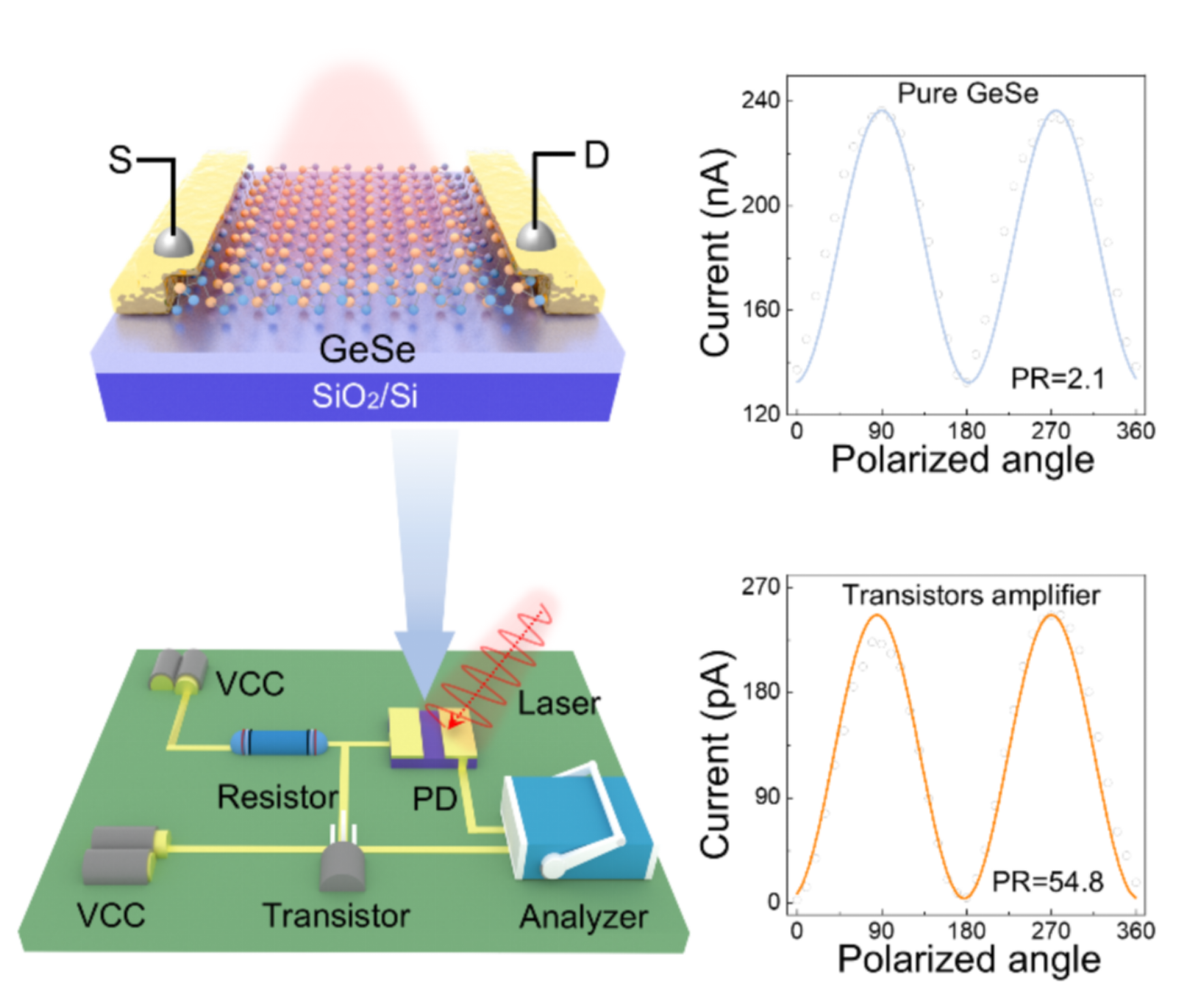 圖4. 低維低對(duì)稱(chēng)面內(nèi)各向異性GeSe偏振探測(cè)器的偏振信號(hào)放大