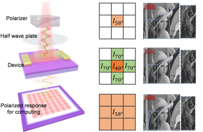 在器件性能方面,通過(guò)構(gòu)筑二維半導(dǎo)體-二維半金屬結(jié)構(gòu)的異質(zhì)結(jié),通過(guò)能帶調(diào)控實(shí)現(xiàn)了柵壓可調(diào)的偏振光電響應(yīng)。面向圖像傳感器在圖像捕獲與處理環(huán)節(jié)分離、感知與計(jì)算單元間的數(shù)據(jù)傳輸增加了功耗的挑戰(zhàn),開(kāi)發(fā)出一種具備柵極調(diào)控和偏振敏感特性的光電探測(cè)器,實(shí)現(xiàn)了正負(fù)值的光電響應(yīng)反轉(zhuǎn),并生成了可變的偏振光電流用于圖像傳感器內(nèi)計(jì)算。結(jié)果表明,該器件通過(guò)預(yù)設(shè)3×3的圖像濾波核,可完成包括銳化、模糊和Sobel算子在內(nèi)的圖像處理任務(wù)。這一技術(shù)的實(shí)現(xiàn)不僅降低了功耗,還為高精度圖像處理發(fā)展?jié)撛谛路较?。相關(guān)研究以“In-Sensor Polarimetric Optoelectronic Computing based on Gate-Tunable 2D Photodetector”為題發(fā)表于《電氣和電子工程師協(xié)會(huì) 電子器件快報(bào)》(IEEE Electron Device Letters 2024, 45 (4), 645-648.,第一作者畢業(yè)博士生于雅俐,通訊作者魏鐘鳴、華南師范大學(xué)霍能杰研究員)