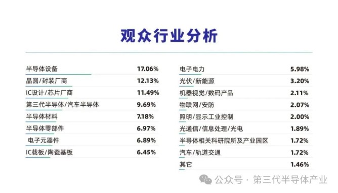 聚焦SEMI-e暨創(chuàng)新展,觀眾構(gòu)成亦呈現(xiàn)專業(yè)度、跨界性與決策力等特征。分析此前參展觀眾所處行業(yè),來自半導(dǎo)體設(shè)備占比17.06%,晶圓/封裝廠商12.13%,IC設(shè)計/芯片廠商11.49%,第三代半導(dǎo)體/汽車半導(dǎo)體9.69%,半導(dǎo)體材料7.18%,半導(dǎo)體零部件6.97%,電子元器件6.89%,IC載板/陶瓷基板6.45%,電子電力5.98%,光伏/新能源3.20%,機(jī)器視覺/數(shù)碼產(chǎn)品2.11%,物聯(lián)網(wǎng)/安防2.07%,照明/顯示工業(yè)控制2.00%,光通信/信息處理/光電1.89%,半導(dǎo)體相關(guān)科研院所及產(chǎn)業(yè)園區(qū)1.72%,汽車/軌道交通1.72%,其他1.46%。