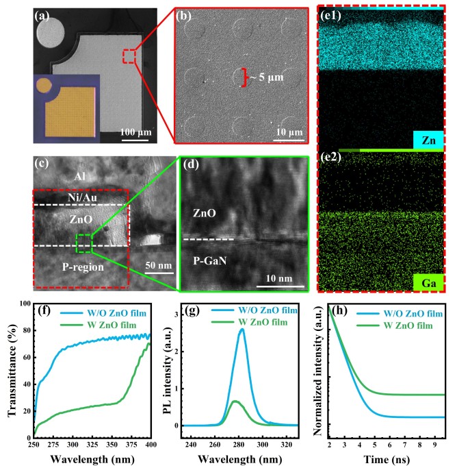 圖1 (a) 器件A的SEM俯視及顯微照片;(b) 臺面區(qū)域的SEM放大圖;(c) 包含Al/Au/Ni/ZnO層與p型區(qū)域的截面STEM圖;(d) n-ZnO/p-GaN界面的STEM高倍放大圖;(e1) 和 (e2) 分別為Zn元素和Ga元素的EDS面分布圖;(f) 有無n-ZnO層的DUV LED晶圓的透過率光譜;(g) 有無n-ZnO層的DUV LED晶圓的光致發(fā)光(PL)光譜;(h) 有無n-ZnO層的DUV LED樣品的時間分辨光致發(fā)光(TRPL)曲線。