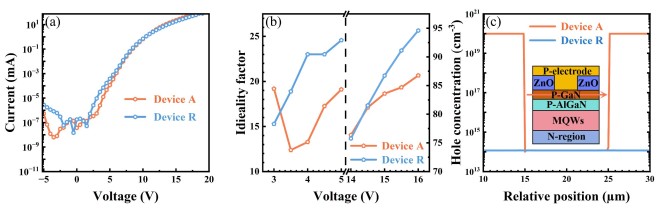 圖2 (a) 器件A與R的實測電流-電壓特性曲線;(b) 器件A與R的理想因子隨注入電流的變化關系;(c) 在20 mA注入電流下,p-GaN層中空穴濃度的計算結果。