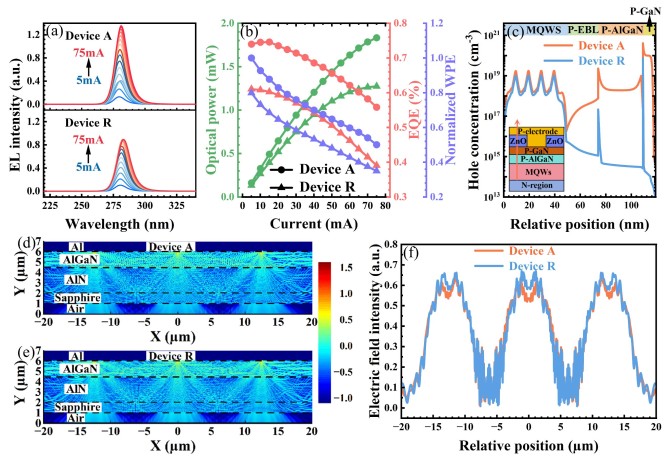 圖3 (a) 器件A與R的實測電致發(fā)光(EL)光譜;(b) 器件A與R的外量子效率(EQE)、光輸出功率及歸一化WPE實測結果;(c) 在20 mA注入電流下,器件A與R的有源區(qū)及p型區(qū)空穴濃度計算分布;(d) 與 (e) 分別為器件A和器件R在TE偏振光下的XY截面電場分布圖;(f) 兩種器件輻射到空氣中的TE偏振光強度一維分布對比。