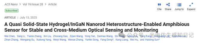 面對(duì)這一挑戰(zhàn),中國科學(xué)技術(shù)大學(xué)孫海定教授團(tuán)隊(duì)將目光投向了自然界——生活在海岸潮間帶的招潮蟹。這種神奇的生物進(jìn)化出了非凡的“兩棲紫外線哨兵”機(jī)制。它們擁有特殊的復(fù)眼結(jié)構(gòu),內(nèi)含對(duì)紫外線敏感的視錐細(xì)胞,能夠?qū)崟r(shí)感知空氣和水環(huán)境中的紫外線強(qiáng)度梯度。一旦監(jiān)測到輻射超標(biāo),它們便能迅速鉆入泥洞或潛入深水躲避傷害。這種高效的跨介質(zhì)生物紫外感知能力,為研究人員突破技術(shù)瓶頸提供了關(guān)鍵靈感。孫海定教授團(tuán)隊(duì)創(chuàng)新性的使用水凝膠/銦鎵氮納米線結(jié)構(gòu)器件,成功研發(fā)出全球首款水陸兩棲自供電紫外線視覺傳感器。突破傳統(tǒng)設(shè)備單介質(zhì)工作限制,在空氣和水下環(huán)境均實(shí)現(xiàn)130.7 mA/W高響應(yīng)度與7.7ms快速響應(yīng),精準(zhǔn)監(jiān)測復(fù)雜濱水環(huán)境的紫外線強(qiáng)度,該工作以“A Quasi Solid-State Hydrogel/InGaN Nanorod Heterostructure-Enabled Amphibious Sensor for Stable and Cross-Medium Optical Sensing and Monitoring”為題發(fā)表在《ACS Nano》上,中國科學(xué)技術(shù)大學(xué)微電子學(xué)院的博士研究生陳煒和碩士研究生李陽為文章的共同一作。該研究得到國家自然科學(xué)基金委的支持。