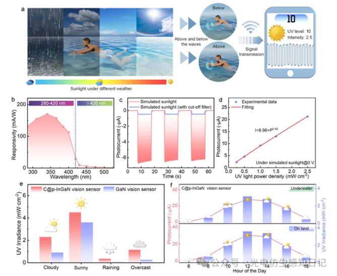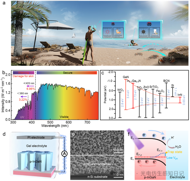 皮膚健康的“隱形殺手”——紫外線,尤其在水陸交錯(cuò)的濱水區(qū)域威脅更大。傳統(tǒng)紫外線傳感器難以兼顧水陸環(huán)境監(jiān)測。中國科學(xué)技術(shù)大學(xué)孫海定教授團(tuán)隊(duì)受招潮蟹生物視覺啟發(fā),成功研發(fā)出全球首款基于水凝膠/氮化銦鎵納米線異質(zhì)結(jié)的自供電水陸兩棲紫外線視覺傳感器。該器件突破環(huán)境限制,在空氣和水下均實(shí)現(xiàn)130.7 mA/W超高響應(yīng)度與7.7毫秒級(jí)快速響應(yīng)。紫外線是皮膚健康的“隱形殺手”,而濱水區(qū)域的紫外線威脅尤為嚴(yán)峻。由于水面產(chǎn)生的菲涅耳反射效應(yīng),濱水區(qū)域的紫外線強(qiáng)度往往比內(nèi)陸高出20-30%。更令人擔(dān)憂的是,國際輻射防護(hù)協(xié)會(huì)(IRPA)的研究指出:水下活動(dòng)時(shí)的紫外線暴露時(shí)常超出安全閾值,這一點(diǎn)卻最容易被人們忽視。傳統(tǒng)的紫外線傳感器雖能在陸地或水下單一環(huán)境中工作,卻無法實(shí)現(xiàn)“水陸無縫切換”,導(dǎo)致在游泳、沖浪、垂釣、灘涂作業(yè)等濱水活動(dòng)場景中存在監(jiān)測盲區(qū),使人們暴露在更高的健康風(fēng)險(xiǎn)中。