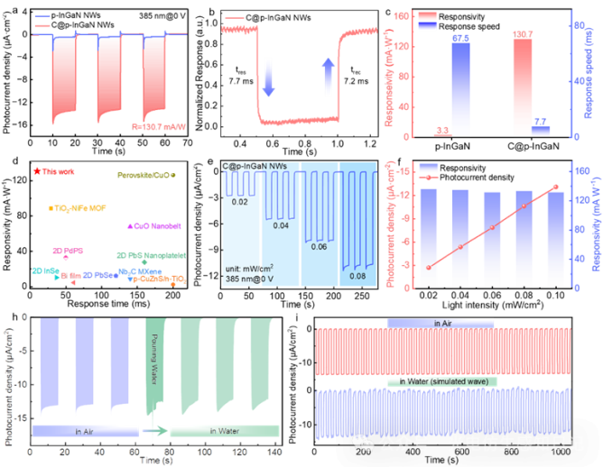 該工作是孫海定教授團(tuán)隊(duì)在光電化學(xué)光探測器方向最新的成果,該團(tuán)隊(duì)通過分子束外延,精準(zhǔn)調(diào)控In的含量,將InGaN納米線帶隙調(diào)至2.75eV,使其能夠?qū)?80-420nm的產(chǎn)生較高的光響應(yīng),并且使用過超薄非晶碳層鈍化技術(shù),通過C-N/O鍵與納米線表面強(qiáng)耦合,鈍化前后器件的響應(yīng)度從3.3 mA/W升至130.7 mA/W(提升39.6倍)(圖2a),響應(yīng)速度達(dá)7.7/7.2 ms(升/降),媲美人眼反應(yīng)速度(圖2b),在385nm光照下,通過調(diào)整光強(qiáng)進(jìn)行器件光電性能測試,發(fā)現(xiàn)器件具有很好的光強(qiáng)線性度(圖2e和圖2f)。在使用水凝膠封裝器件之后,使其具有跨介質(zhì)探測紫外光的功能,并且在空氣中和在水下,器件均有良好的探測效率和穩(wěn)定性,在連續(xù)工作1000s的開關(guān)光測試下,性能無衰減(圖2h和i)。