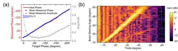 圖2. (a)芯片的相位調(diào)制精度測量結(jié)果,(b)遠場方向圖