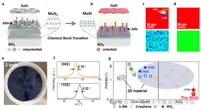 針對(duì)這一問(wèn)題,南京大學(xué)研究團(tuán)隊(duì)同阿卜杜拉國(guó)王科技大學(xué)共同提出了創(chuàng)新性的“化學(xué)鍵轉(zhuǎn)換”策略,將范德華鍵結(jié)合的二硫化鉬(MoS2)材料轉(zhuǎn)化為共價(jià)鍵結(jié)合的氮化鉬(MoN)材料,轉(zhuǎn)換后的MoN晶格取向完全繼承了單晶MoS2的薄膜特性。利用這一新型MoN作為緩沖層,在非晶SiO2襯底上成功實(shí)現(xiàn)了取向高度一致的晶圓級(jí)單晶GaN薄膜外延生長(zhǎng),該GaN薄膜晶體質(zhì)量與傳統(tǒng)單晶襯底上生長(zhǎng)的薄膜質(zhì)量相當(dāng)(圖1)。這一策略既利用了二維材料的可轉(zhuǎn)移性,又通過(guò)強(qiáng)化學(xué)鍵轉(zhuǎn)換構(gòu)筑了晶向匹配、易于成核的外延表面,從而使氮化物薄膜外延不再受限于單晶襯底,在非晶襯底上同樣可以實(shí)現(xiàn)材料的晶圓級(jí)規(guī)?;苽?。