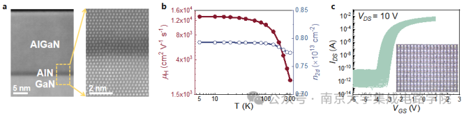 通過(guò)這一創(chuàng)新技術(shù),團(tuán)隊(duì)進(jìn)一步在非晶SiO2襯底上外延了AlGaN/AlN/GaN異質(zhì)結(jié)構(gòu),在異質(zhì)界面處二維電子氣(2DEG)的室溫遷移率高達(dá)2240 cm²V-¹s-¹,展現(xiàn)出卓越的電學(xué)性能?;谠摻Y(jié)構(gòu)制造的高電子遷移率晶體管(HEMT)性能接近傳統(tǒng)單晶襯底上的外延器件表現(xiàn),是國(guó)際上在非晶襯底上直接外延實(shí)現(xiàn)氮化鎵基HEMT晶體管的首次報(bào)道(圖2)。這一技術(shù)進(jìn)展為III族氮化物半導(dǎo)體異質(zhì)異構(gòu)集成提供了直接外延的新方法,是高性能III族氮化物半導(dǎo)體光電器件擺脫襯底約束、在功能非晶基底上直接集成的全新技術(shù)方案。