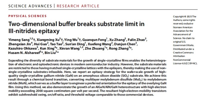 近日,南京大學(xué)莊喆、劉斌、張榮團(tuán)隊(duì)聯(lián)合沙特阿卜杜拉國(guó)王科技大學(xué)(KAUST)、合肥工業(yè)大學(xué)等單位,成功開(kāi)發(fā)出一種在非晶襯底(如二氧化硅SiO?、石英)上實(shí)現(xiàn)高質(zhì)量單晶III族氮化物半導(dǎo)體薄膜外延生長(zhǎng)新技術(shù)。該研究成果突破了半導(dǎo)體材料外延對(duì)單晶襯底的依賴,為未來(lái)材料和器件的異質(zhì)異構(gòu)集成開(kāi)辟了創(chuàng)新技術(shù)路徑。相關(guān)研究成果近期以“Two-dimensional buffer breaks substrate limit in Ⅲ-nitrides epitaxy”為題發(fā)表于《Science Advances》期刊。