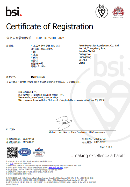 廣東芯粵能半導(dǎo)體有限公司(以下簡(jiǎn)稱“芯粵能”)于2025年7月正式獲得由國(guó)際權(quán)威認(rèn)證機(jī)構(gòu)英國(guó)標(biāo)準(zhǔn)協(xié)會(huì)(BSI)頒發(fā)的ISO/IEC 27001:2022信息安全管理體系認(rèn)證證書。