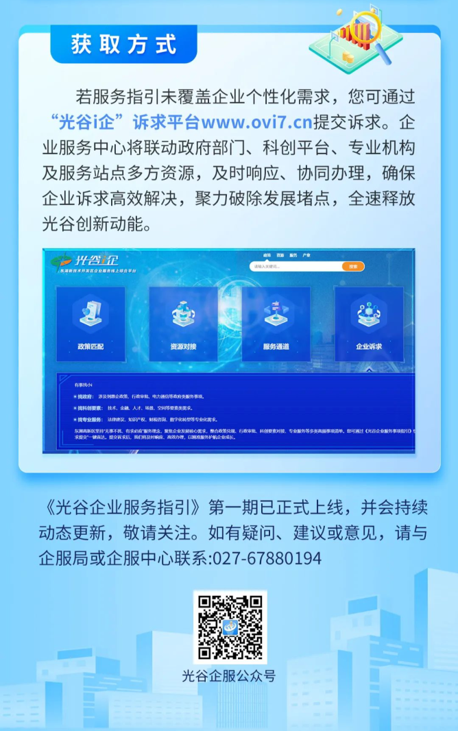 企業(yè)可通過(guò)“光谷i企”小程序或訪問(wèn)網(wǎng)頁(yè)(www.ovi7.cn)下載《指引》,一鍵直達(dá)所需服務(wù),獲取最精準(zhǔn)、高效的企業(yè)服務(wù)指引。
