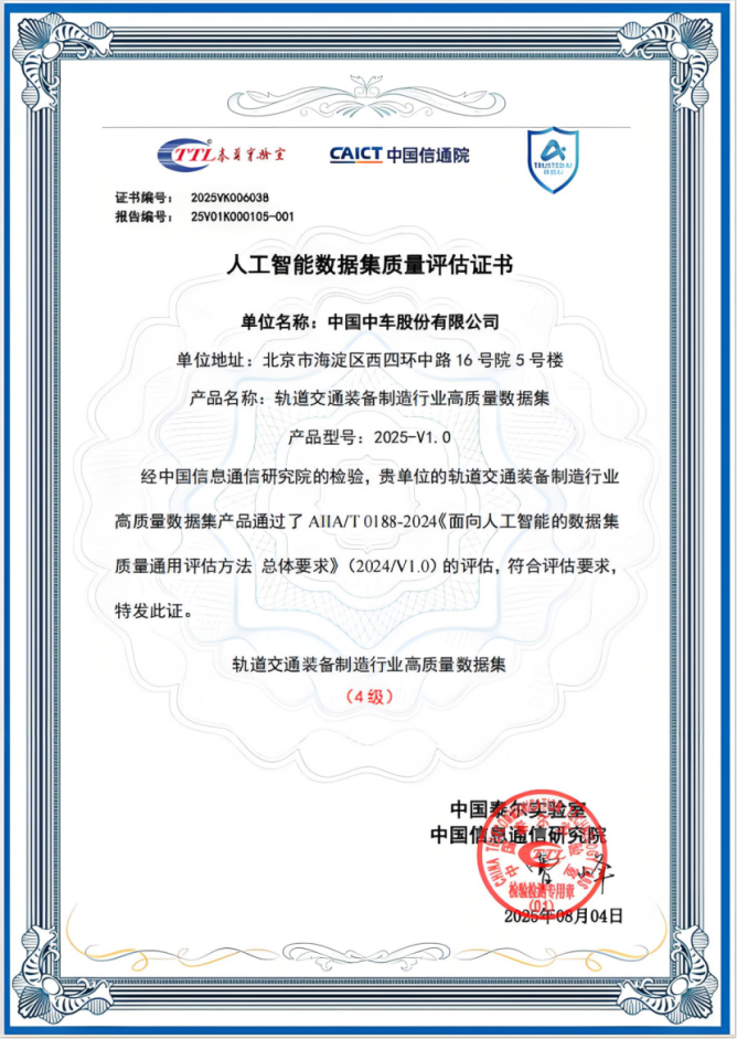 2025年8月,中國中車集團有限公司順利通過中國信通院可信AI人工智能數(shù)據(jù)集質(zhì)量4級評估,成為制造行業(yè)中首個獲得最高評級的中央企業(yè)。此次評估嚴(yán)格依據(jù)中國信通院牽頭編制的《面向人工智能的數(shù)據(jù)集質(zhì)量通用評估方法 總體要求》(2021-1303T-YD)行業(yè)標(biāo)準(zhǔn)開展,標(biāo)志著中國中車在人工智能高質(zhì)量數(shù)據(jù)建設(shè)方向邁入行業(yè)“頂尖”水平。