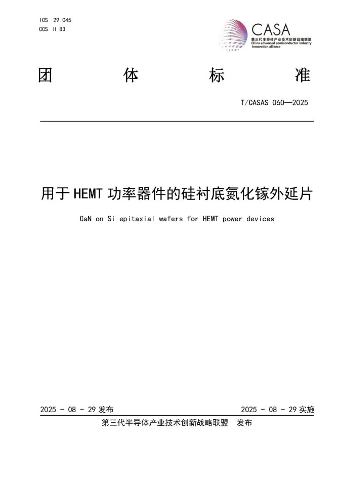 由蘇州晶湛半導(dǎo)體有限公司牽頭制定,遵循CASAS標(biāo)準(zhǔn)制定流程,經(jīng)過(guò)標(biāo)準(zhǔn)起草小組會(huì)議討論、廣泛征求意見(jiàn)、委員會(huì)草案投票等流程,團(tuán)體標(biāo)準(zhǔn)T/CASAS 060—2024《用于HEMT功率器件的硅襯底氮化鎵外延片》于2025年8月29日正式面向產(chǎn)業(yè)發(fā)布。