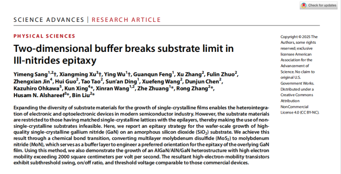 近日,南京大學莊喆、劉斌、張榮團隊聯(lián)合沙特阿卜杜拉國王科技大學(KAUST)、合肥工業(yè)大學等單位,成功開發(fā)出一種在非晶襯底(如二氧化硅SiO?、石英)上實現(xiàn)高質量單晶III族氮化物半導體薄膜外延生長新技術。該研究成果突破了半導體材料外延對單晶襯底的依賴,為未來材料和器件的異質異構集成開辟了創(chuàng)新技術路徑。相關研究成果近期以“Two-dimensional buffer breaks substrate limit in Ⅲ-nitrides epitaxy”為題發(fā)表于《Science Advances》期刊。