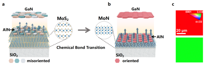 針對這一問題,南京大學研究團隊同阿卜杜拉國王科技大學共同提出了創(chuàng)新性的“化學鍵轉換”策略,將范德華鍵結合的二硫化鉬(MoS2)材料轉化為共價鍵結合的氮化鉬(MoN)材料,轉換后的MoN晶格取向完全繼承了單晶MoS2的薄膜特性。利用這一新型MoN作為緩沖層,在非晶SiO2襯底上成功實現(xiàn)了取向高度一致的單晶GaN薄膜外延生長(圖1)。這一策略既利用了二維材料的可轉移性,又通過強化學鍵轉換構筑了氮化物半導體薄膜外延晶格匹配關系,從而使氮化物薄膜外延不再受限于單晶襯底,在非晶襯底上同樣可以實現(xiàn)材料的晶圓級規(guī)?;苽?。