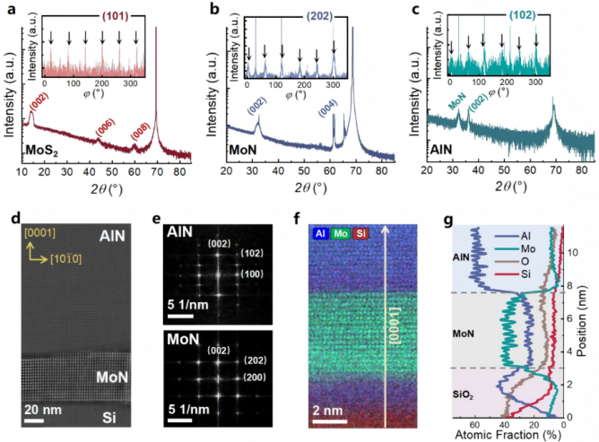 圖2的XRD結果顯示,藍寶石襯底上的原始MoS2、氮化處理后的MoN,以及后續(xù)磁控濺射生長的AlN均為六方晶格結構,三者具有一致的面外面內晶向;AlN/MoN界面TEM圖像展現(xiàn)了AlN有序的原子排列和清晰的原子界面,并通過對AlN和MoN原子結構進行快速傅里葉變換,進一步證實了AlN和MoN晶格間的外延關系。通過晶格常數(shù)計算發(fā)現(xiàn),MoN與AlN的晶格失配僅約8%,顯著小于AlN與藍寶石或Si襯底的失配度,這一特性證明了MoN緩沖層在多種材料襯底上外延生長Ⅲ族氮化物薄膜的應用潛力。
