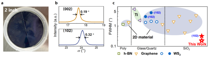 基于上述SiO2非晶襯底上構建的AlN/MoN模板,團隊利用MOCVD設備,成功實現(xiàn)了2英寸高質量氮化鎵薄膜的外延生長。該GaN薄膜表面粗糙度僅為0.168nm,面外(002)面和面內(102)面搖擺曲線半峰寬分別低至0.19°和0.32°,其中非晶襯底上GaN薄膜(102)面的半峰寬指標目前國際上鮮有報道,團隊基于MoN緩沖層策略生長的GaN薄膜質量達到非晶/多晶襯底生長的當前領先水平。此外,團隊在石英襯底上重復該策略,同樣實現(xiàn)了單晶GaN薄膜外延,驗證了該技術路線的普適性。