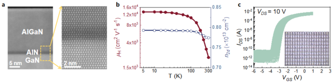 圖4:非晶SiO2襯底上外延的AlGaN/AlN/GaN異質結及制備的HEMT器件性能