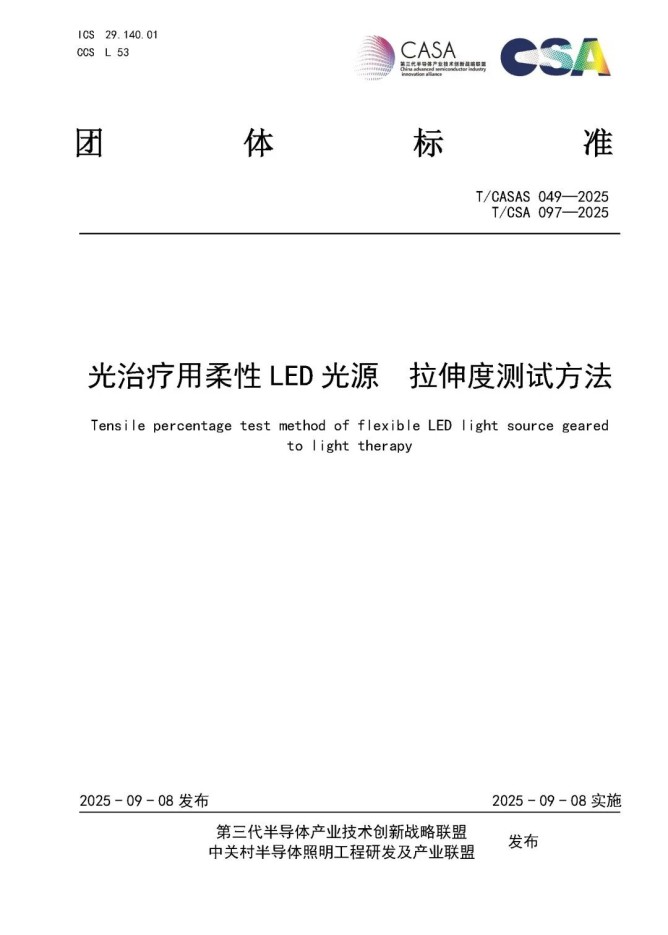 由中國科學院長春光學精密機械與物理研究所牽頭制定,遵循CASAS & CSAS標準制定流程,經過標準起草小組會議討論、廣泛征求意見、委員會草案投票等流程,團體標準T/CASAS 049(T/CSA 097)—2025《光治療用柔性LED光源 拉伸度測試方法》、T/CASAS 058(T/CSA 103)—2025《光治療用柔性LED光源 拉伸彎曲可靠性試驗方法》、T/CASAS 059(T/CSA 104)—2025《光治療用柔性LED光源 輻照度均勻性測試方法》于2025年9月8日正式面向產業(yè)發(fā)布,三項標準由第三代半導體產業(yè)技術創(chuàng)新戰(zhàn)略聯盟(CASA)與中關村半導體照明工程研發(fā)及產業(yè)聯盟(CSA)聯合制定發(fā)布。
